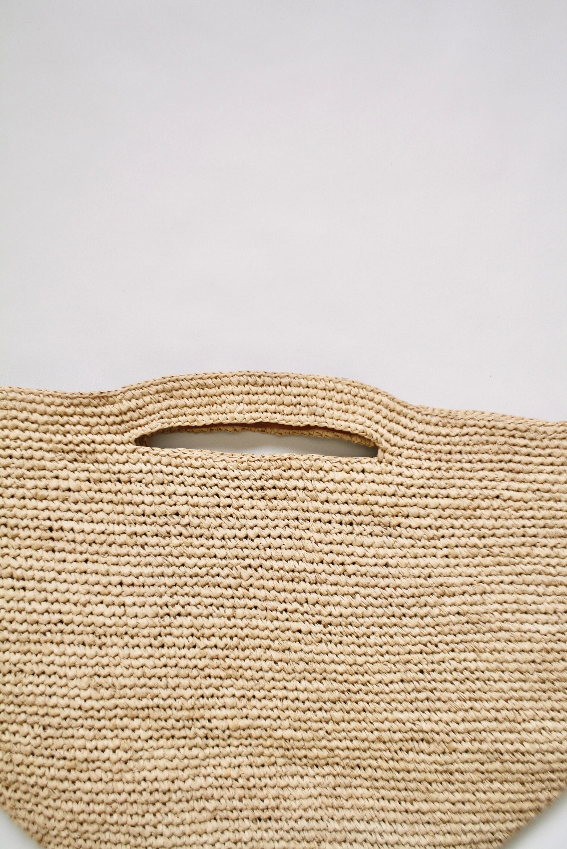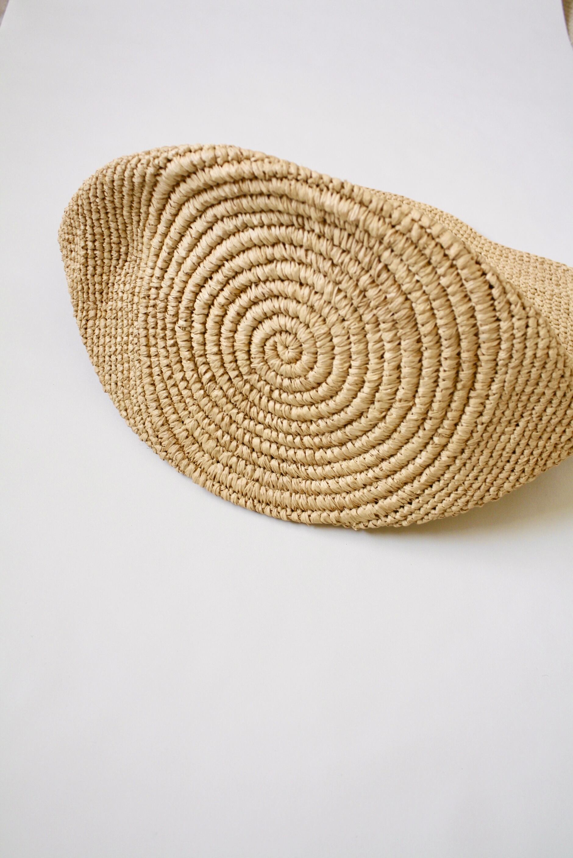 海に浮かぶボートのようなころんと丸みのあるフォルムと手元の続き編みがポイントになったラフィアバッグが届きました。