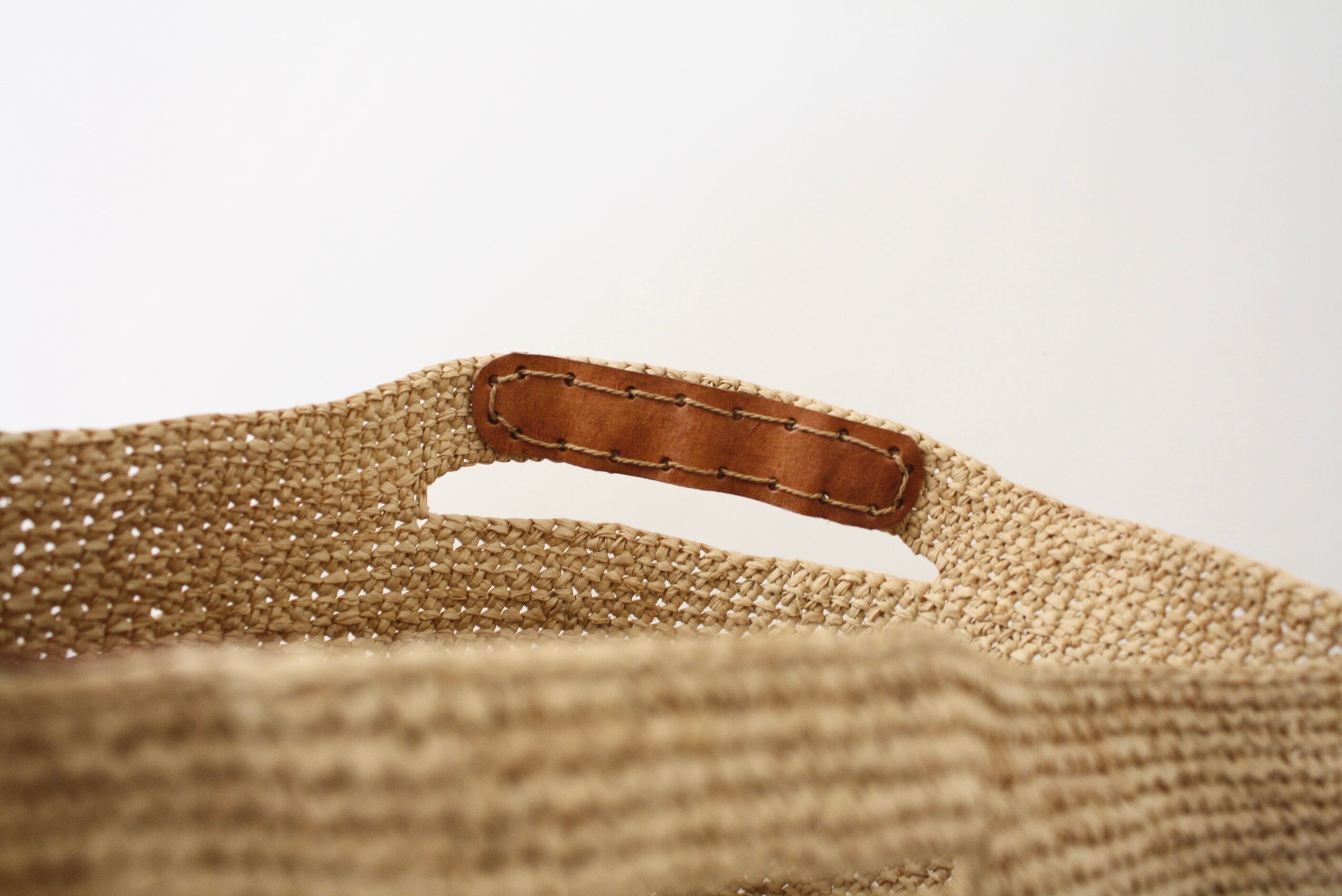 天然繊維ラフィアの持ち手にレザーを組み合わせたことでナチュラルすぎずにさまざまなスタイルに合わせていただけます。